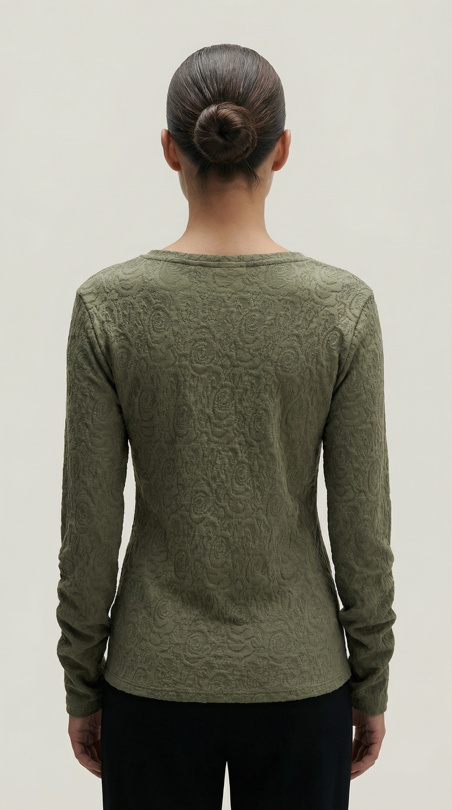 Designed to be worn two ways: a clean round neckline for understated polish, or a soft V for a more defined, feminine line. The elongated sleeves gather gently toward the wrists, adding fluidity and a signature Nunnchi silhouette.