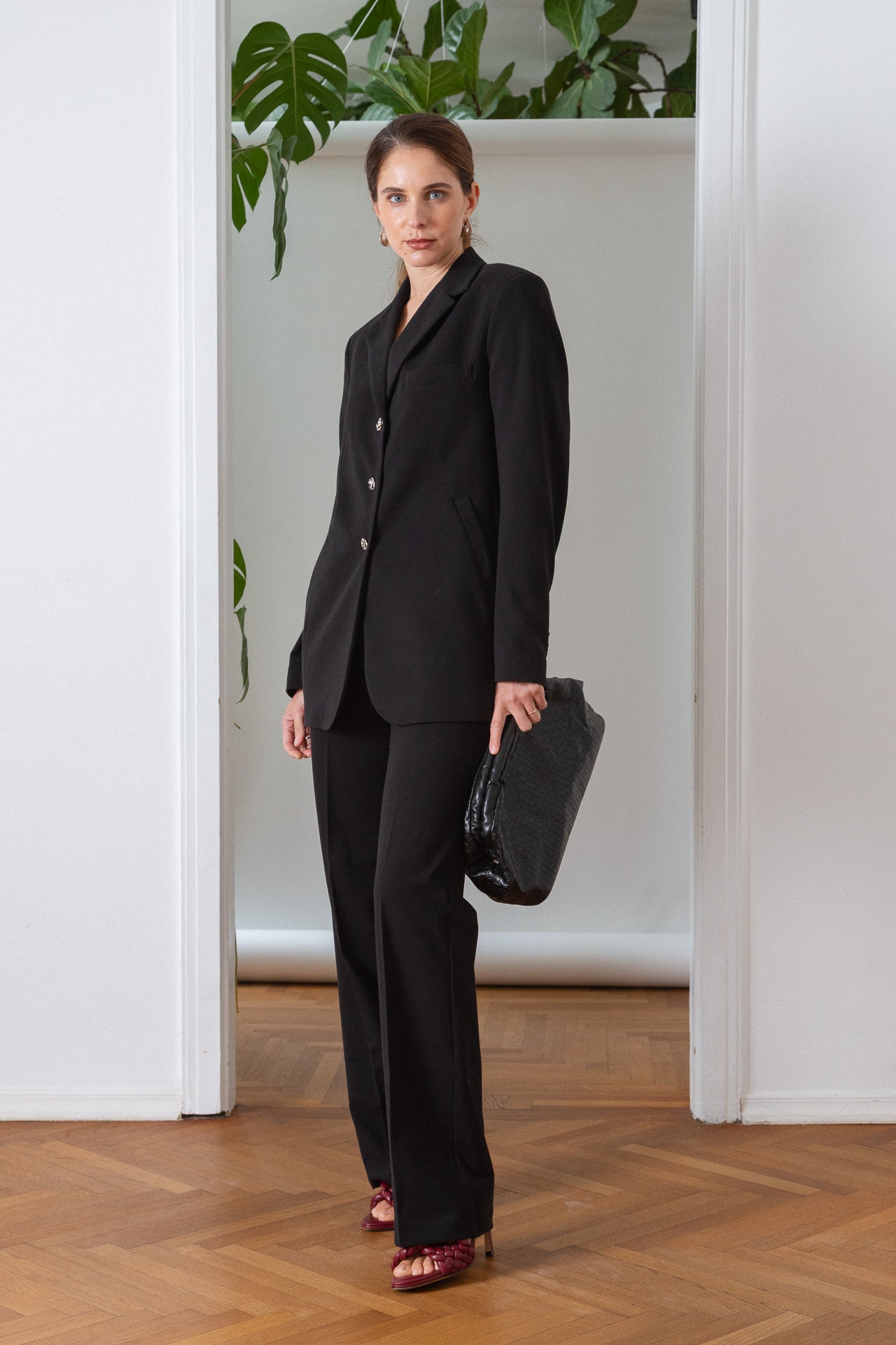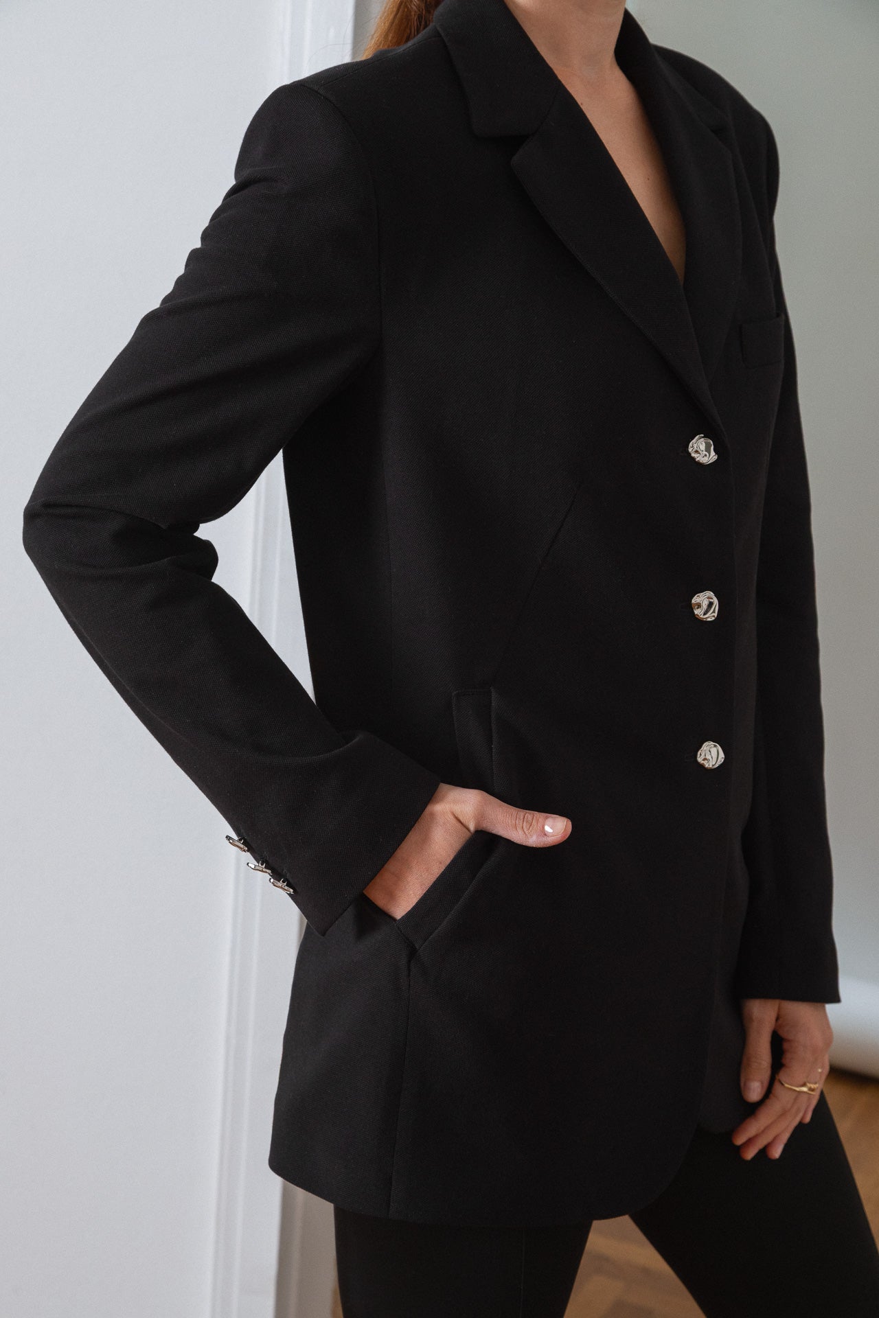 A tailored yet relaxed blazer made from 100% cotton piqué — soft, breathable, and easy to care for. Designed with distinctive asymmetrical silver buttons, shoulder pads, and side pockets. Washable at 30°C, quick to dry, and easy to iron.
