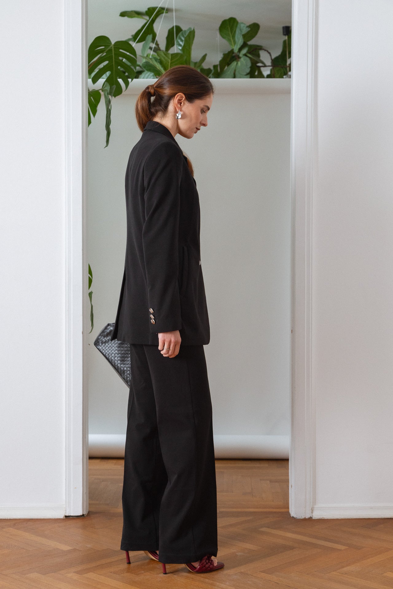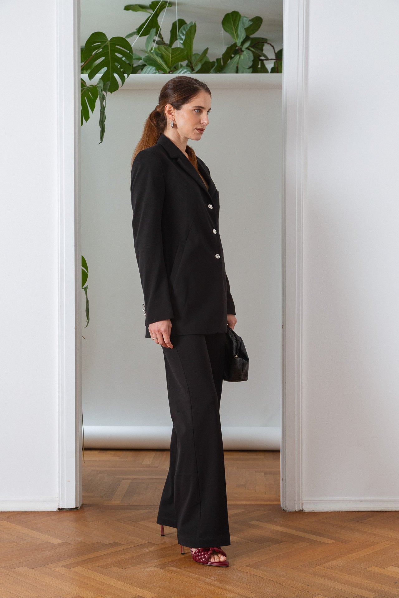 This suit includes the signature oversized blazer with asymmetrical silver buttons and shoulder pads, and the tailored pants with adjustable waist tabs. Breathable, washable, and designed to move with you.